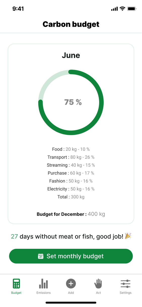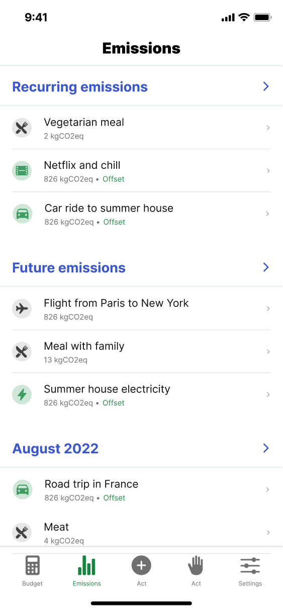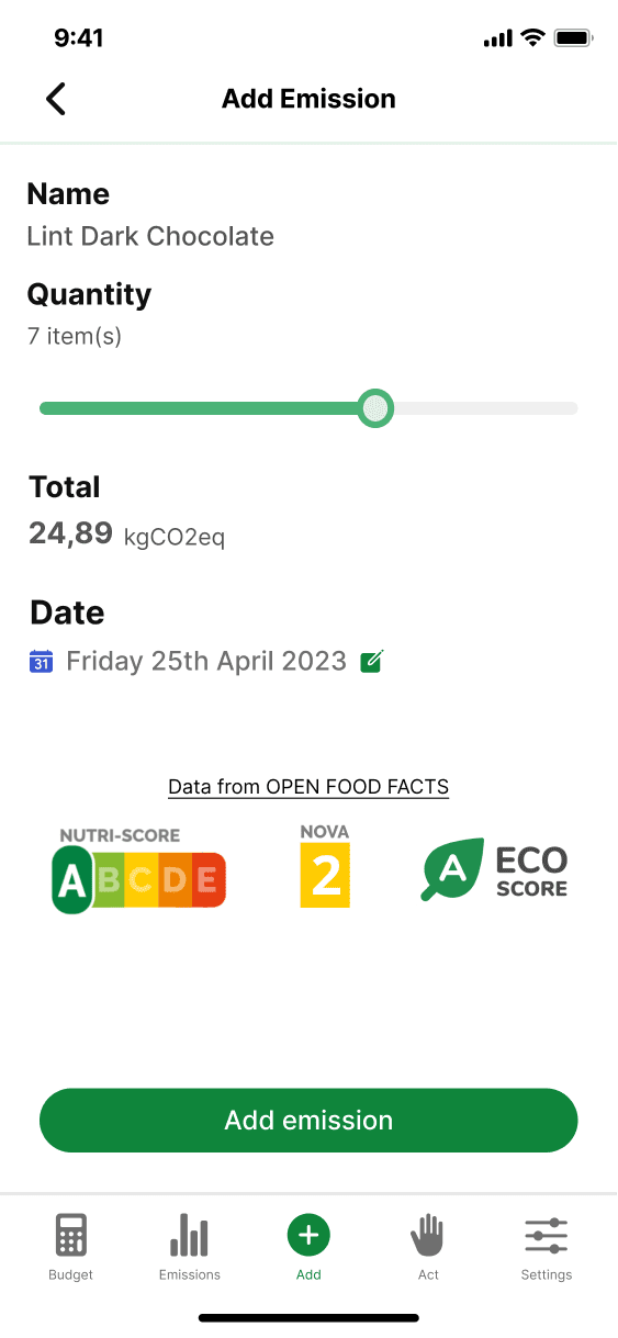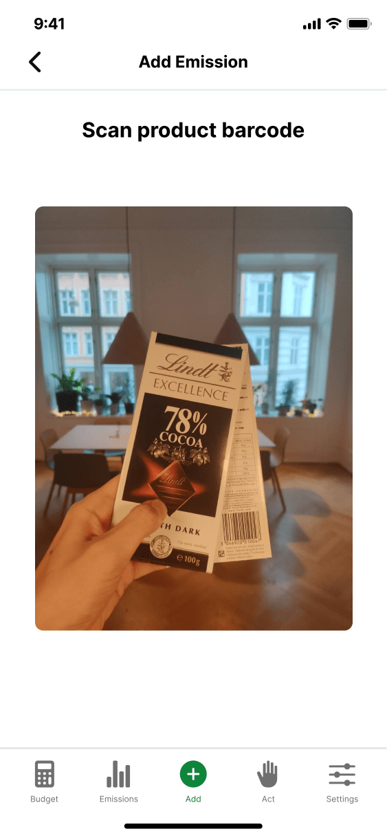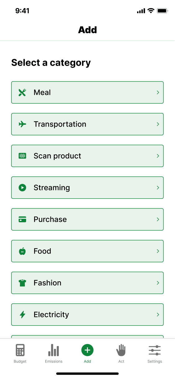Transport, food, electricity, streaming, clothing, cryptocurrency, purchases... any kind of carbon emission is available in the app. You can even scan barcodes on food products to get the environmental impact of what you eat!